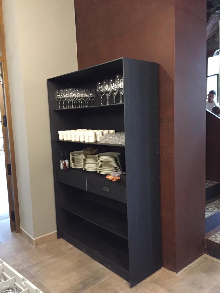 Armario cubiertos negro: hecho con cuadrado de 25×25, chapa microperforada , con cajones con guias ocultas lacado al horno con laca traslucida.